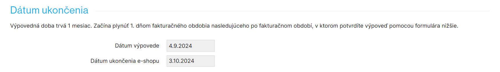 V sekcii Dátum ukončenia sú dve polia, ktoré sa vyplňujú automaticky a nie je možné ich meniť. Dátum výpovede je vždy stanovený na dnešný dátum. Dátum ukončenia e-shopu je určený na základe našich Všeobecných obchodných podmienok s jednomesačnou výpovednou lehotou, ktorá sa počíta od ďalšieho fakturačného dňa.