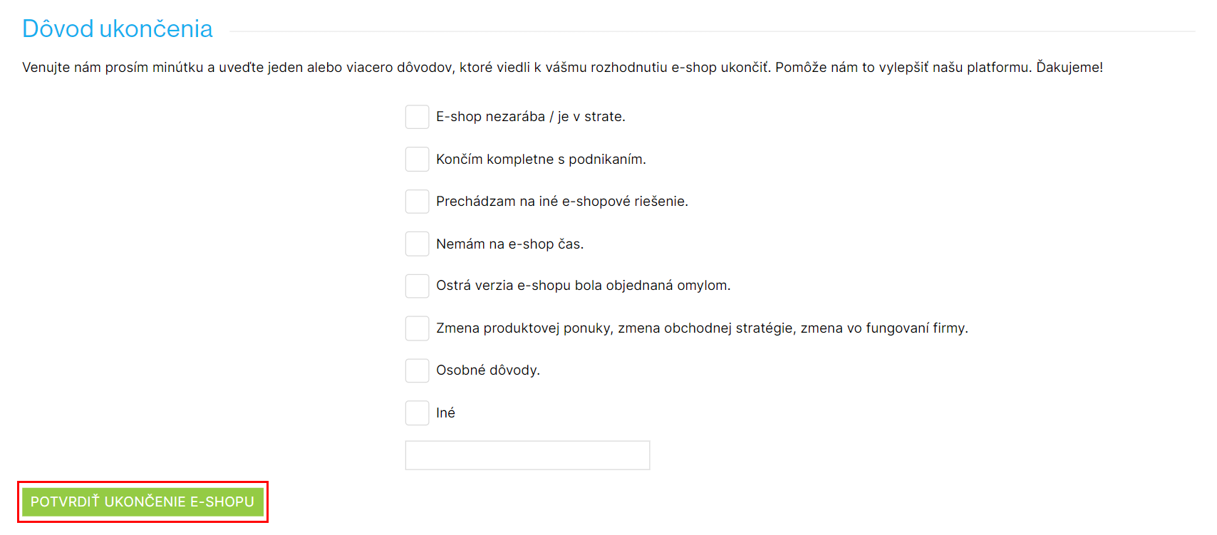 Vyplnenie sekcie Dôvod ukončenia nie je povinné, ale budeme vám veľmi vďační, ak nám uvediete dôvod (prípadne dôvody), ktoré vás viedli k ukončeniu e-shopu. Vaša spätná väzba nám pomáha zlepšovať našu platformu.