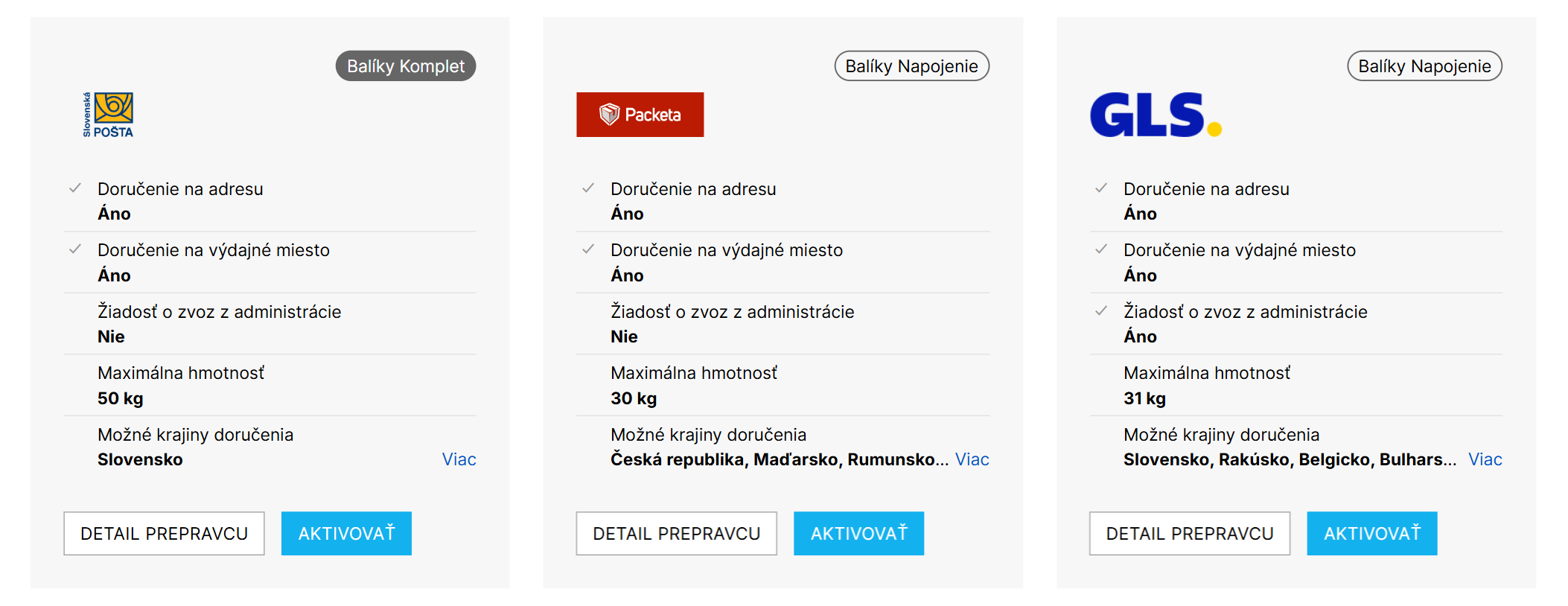 Pri každom prepravcovi vidíte, či ide o službu Balíky Komplet alebo Balíky Napojenie. Prepravcov z oboch služieb je možné ľubovoľne kombinovať. Tiež je možné jedného prepravcu využívať v oboch službách.