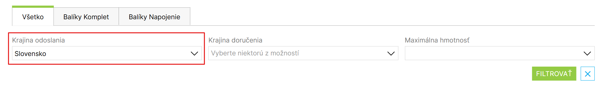 Medzi prepravcami môžete ľahko filtrovať – podľa Krajiny odoslania (odkiaľ expedujete), Krajiny doručenia alebo Maximálnej hmotnosti. Odosielanie je aktuálne podporované iba zo Slovenska alebo Českej republiky. Ponuka prepravcov sa môže líšiť podľa vybranej Krajiny odoslania.